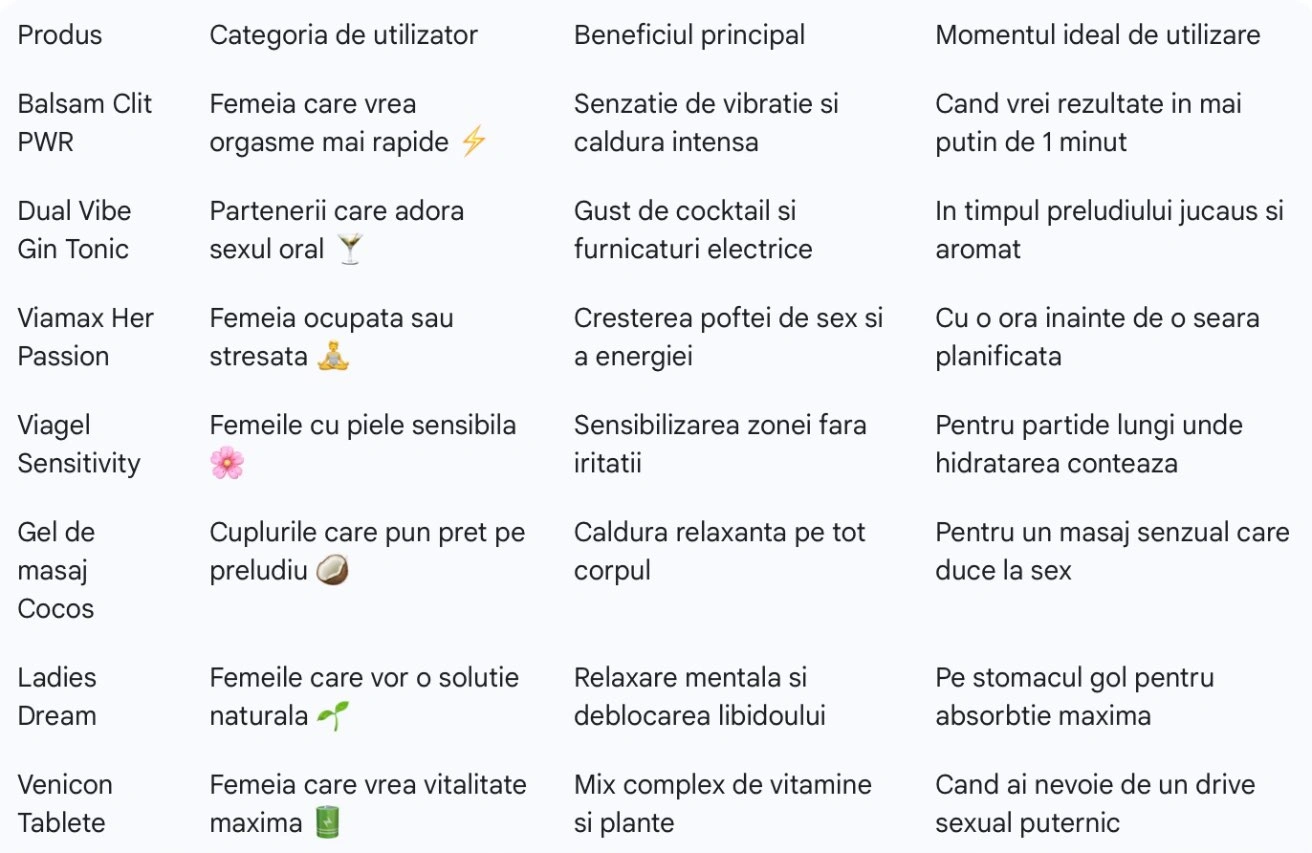 In acest articol, analizam cele mai apreciate produse ale anului, punand fata in fata solutiile topice si stimulentele sexuale pentru femei care redefinesc experienta intima. Pentru a te ajuta sa alegi exact ce rezoneaza cu dorintele tale, am evaluat fiecare produs prin prisma unor factori de performanta determinanti. Vom analiza tipul de senzatie oferit (fie ca e vorba de caldura, furnicaturi sau pulsatii), timpul de reactie necesar pentru a simti primele efecte si compozitia sau aroma, elemente care pot transforma complet atmosfera in dormitor. De asemenea, ne uitam la ingredientele active care stau la baza eficientei si la durata efectului, pentru ca tu sa stii exact la ce sa te astepti de la fiecare aplicare sau administrare.